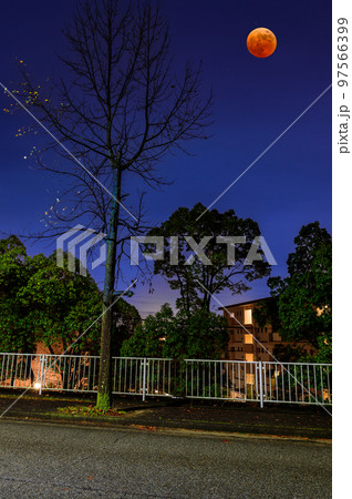 夕暮れの街路樹と皆既月食、中山五月台、宝塚市、11月8日、日本