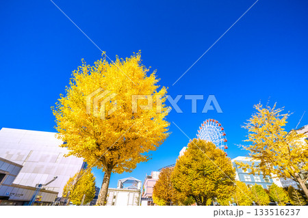 日本の横浜都市景観11月22日。センター北駅前、都築阪急の観覧車などを望む