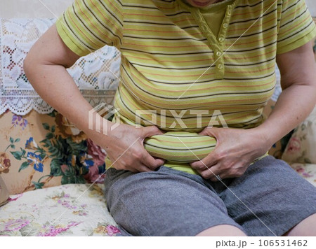お腹の脂肪をつまむ中年女性