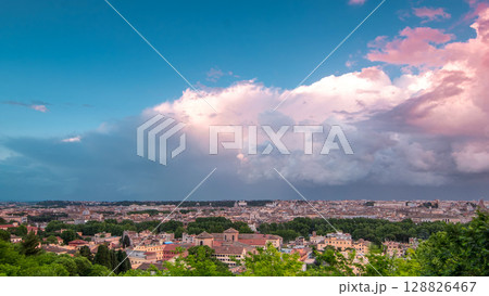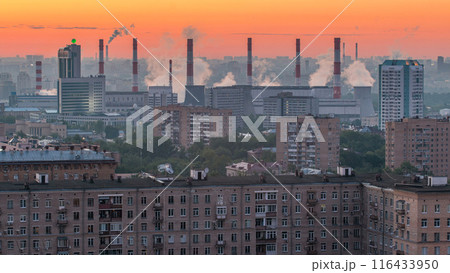 Cityscape timelapse, residential buildings, park areas, smoking pipes in distance, horizon, morning mist before sunrise, Moscow, Russia