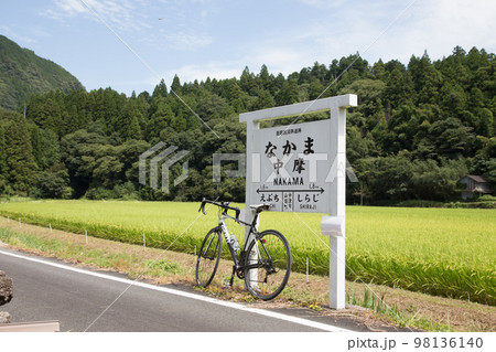 メイプル耶馬サイクリングロード 旧中摩駅看板の前で記念写真イメージ