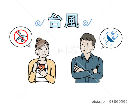 台風の影響に困る男女 悪天候 欠航 トラブル イラスト
