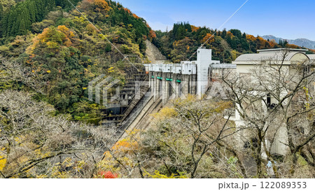 秋晴れを背景に松原ダム周辺紅葉風景(大分県中津江)(熊本県阿蘇郡小国町)県境