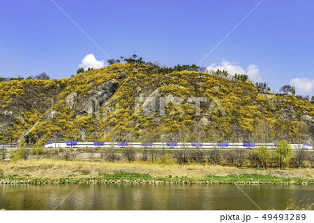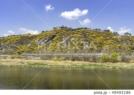 レンギョウの花咲く鷹峰山と中浪川の風景【ソウル特別市城東区】