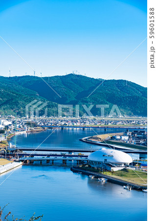快晴の石巻市街と旧北上川中瀬と風力発電所