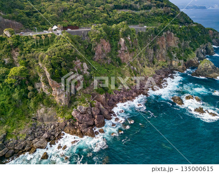 石廊崎オーシャンパークのドローン撮影。 白く美しい石廊崎灯台、岬の先端の断崖絶壁に石室神社がある。