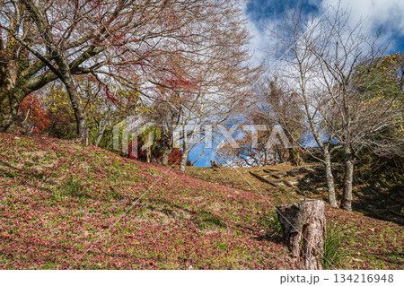 初冬の里山風景 山を彩るモミジの落ち葉 京都府笠置町