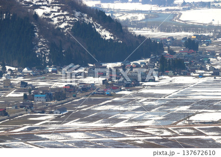 雪融け:冬晴れの田園地帯(新潟県南魚沼市水尾地区)