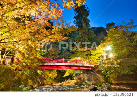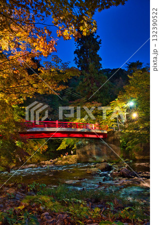日本 青森県黒石市にある中野もみじ山のライトアップされた紅葉