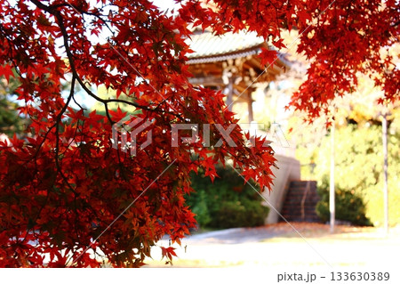 陽射しを浴びる福蔵院の赤く染まった楓と鐘楼堂(7)