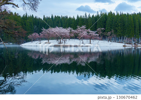 早春残雪に咲く新潟県十日町市津南町中子池の桜