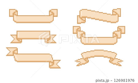 Ribbon banners pixel art Y2K vector set, cartoon vintage tape frames with squared contour, sticker for promotion design