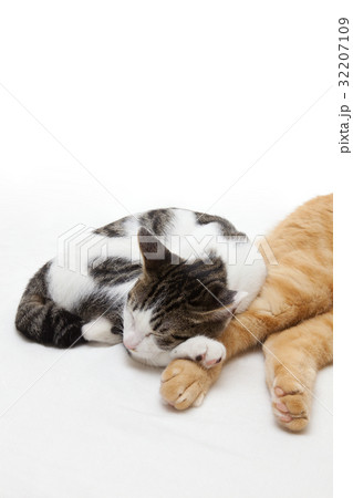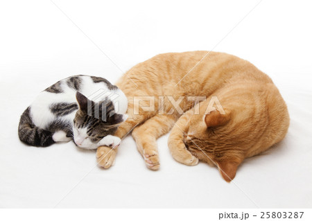 茶トラの猫に寄り添って眠る子猫