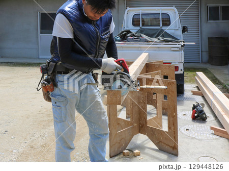 大工さんが丸ノコと丸ノコ用角度切り定規を使って木材を切断している