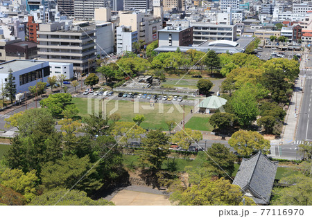 丸亀市民広場を丸亀城から見る(右下は大手一の門、左上は四国電力)