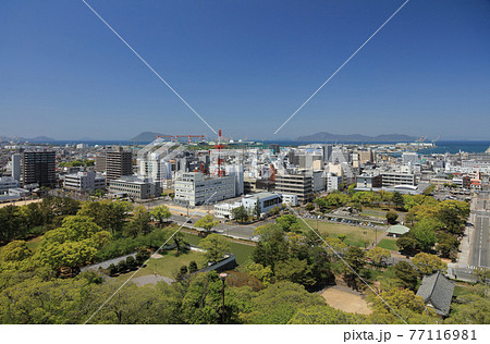 丸亀城から見る丸亀市街と瀬戸内海(丸亀市役所新庁舎、丸亀港)