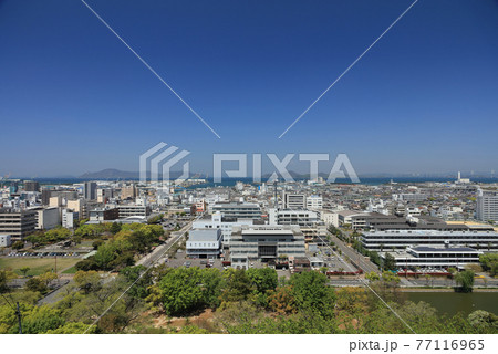 春、桜満開の丸亀城から見る丸亀市街と瀬戸内海(丸亀市役所新庁舎、丸亀港)
