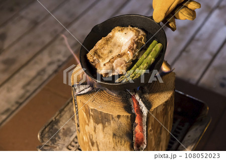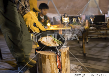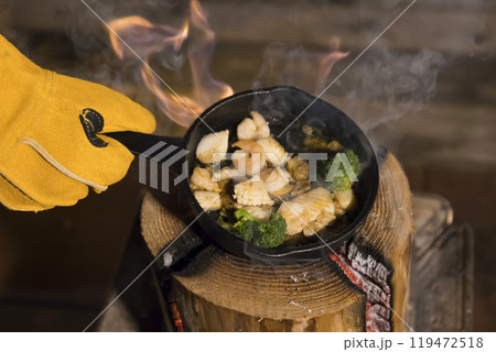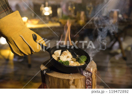 グランピング施設でスウェーデントーチで鶏肉を焼く男性手元