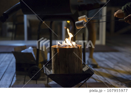 スウェーデントーチで焼きマシュマロをする子供手元とバーベキューグリルでバーベキューをする父親足元