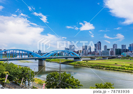 【神奈川県】快晴の武蔵小杉の高層マンションと丸子橋