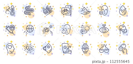 Outline set of Mental health, Sunscreen and Medical mask line icons for web app. Include Mountain bike, Capsule pill, Intestine pictogram icons. Cardio training, Sunglasses, Skin care signs. Vector