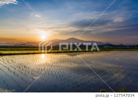 夕暮れの平塚郊外の水田と丹沢山脈