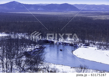 朝日で輝く雪裡川から飛び立つタンチョウ