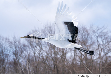 青空を飛ぶタンチョウ(北海道・鶴居)