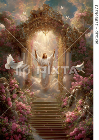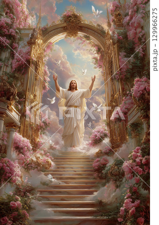 楽園の入口にバンザイして立つイエス・キリストのスピリチュアルなイラスト