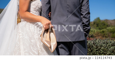 bride holding shoes standing next to the groom's arm Take photos of couples in international clothing