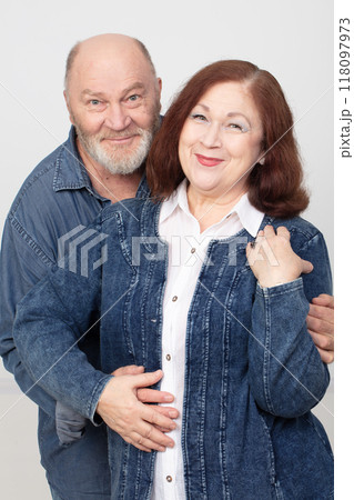 Portrait of an elderly cheerful couple in love in denim clothes.