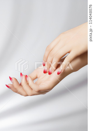Nail extensions, manicure, nail correction, hands in the foreground gel polishes