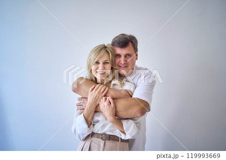 Elderly couple in love smiles rejoicing at happy family life and poses for picture to golden wedding