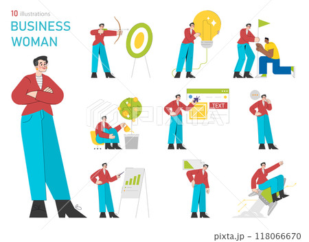 Businesswoman set. Portrayal of professional activities, innovation, and leadership. Capturing goal achievement, strategy planning, and financial growth. Vector illustration.