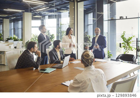 In a corporate setting businessman leads a meeting, passionately presenting a business plan to his attentive team, fostering collaboration and strategic thinking