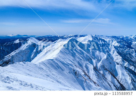 雪の谷川岳・山頂付近より望む稜線の山並み(ぐんま県境稜線トレイル)