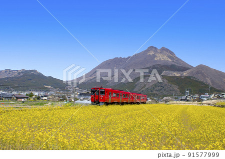 湯布院 由布岳と菜の花畑を走る赤い列車