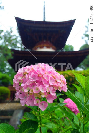 大きく一輪咲くピンク色の紫陽花と背景に写る久米寺の多宝塔