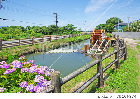 人気観光スポット紫陽花が咲く朝倉市の久重二連水車
