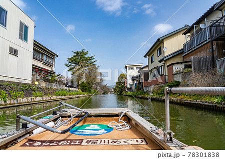 島根県松江市 松江城の堀川めぐり 町並みの横を通り過ぎる船からの眺め