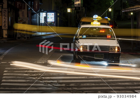 夜の静かな繁華街の片隅で客待ちをするタクシー