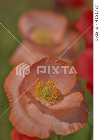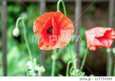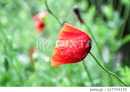 朝雨で濡れたシャレーポピーの花びらを照らす光景