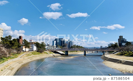 秋晴れの青空に映える西三河総合庁舎と殿橋の風景〈乙川下流右岸/愛知県岡崎市〉