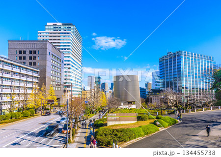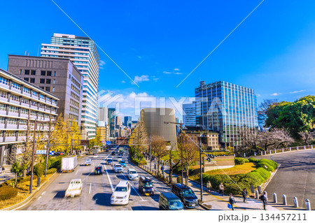 東京都 靖国通り田安門交差点から見る晴天の九段下市街風景
