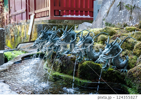 箱根九頭龍神社の九頭龍手水の様子