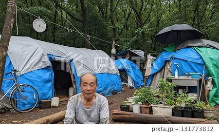 公園の隅っこでブルーシートハウスで暮らすホームレス