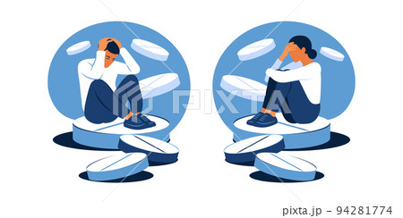 Concept of medication treating illness or disorder. Concept of antidepressants. Depressed man and woman is sitting on big pill. Medicine.
