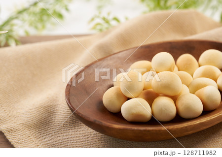 沢山のタマゴボーロとスプーンの上のタマゴボーロ