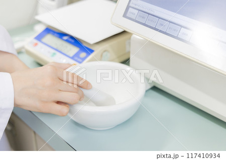 粉砕調剤とハンドブックで調べる薬剤師。乳棒と乳鉢が置かれている