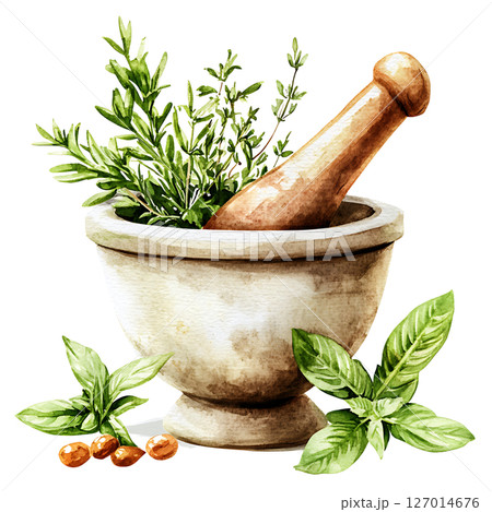 White mortar for herbs and calendula flowers. Preparation of herbal tea, tonic. The concept of phytotherapy, laboratory. Composition for the label design of home ecological products. Watercolor.